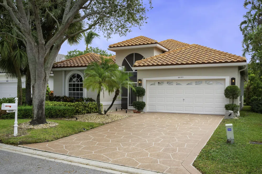 Welcome home to this stunning and updated Fairport model in Winston Trails golf community with NO MANDATORY FEE! This spectacular home features 3 bedrooms, 2 baths and an OPEN CONCEPT FLOOR PLAN with spectacular views of the lake from the great room, kitchen and master bedroom! The kitchen has been updated with 42'' wood cabinets w/pull-outs, pots & pan drawers, marble countertops, stone tile backsplash & newer SS upgraded appliances. Neutral porcelain tile throughout the living area w/raised baseboards & updated wood-look tile flooring in the bedrooms. The master retreat offers his & hers walk in closets, both outfitted with the California Closet System. The master bath has been renovated with a step down shower with seamless glass, a soaking tub, new cabinets with marble countertops and new flooring. This home has been freshly painted inside and out and boasts a 7 year old roof, newer washer & dryer, 2019 A/C vented in the garage, and accordion shutters throughout. The backyard offers SE exposure with an oversized screen enclosed patio with a Sunbrella motorized awning and is spacious enough for entertaining and family barbecues. Additionally, the community pool and tennis courts are right around the corner from the home. Winston Trails is a manned gated community that offers 18-hole golf course (no mandatory fee), fitness center, a restaurant open for lunch and dinner called Winston's On the Green, playgrounds, Olympic size heated pool, 16 tennis courts & pickleball courts and so much more. Low HOA fee includes manned gate security, 24-HR. roaming security, cable w/some premium channels, Internet/Wi-Fi, and common areas. The community is located in an A-rated school district, has easy access to I-95, the Turnpike, and 441, and has plenty of shopping and restaurants nearby!